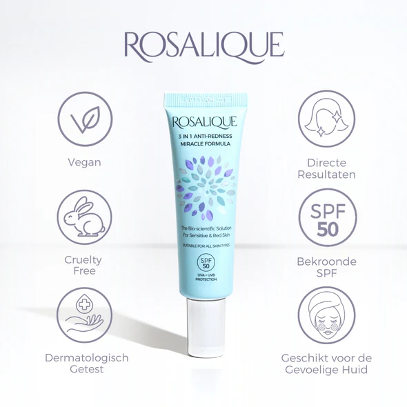 Rosalique 3 in 1 Anti-Redness Miracle Formula is vegan, cruelty-free, dermatologisch getest en non-comodogeen.