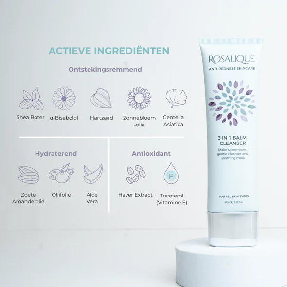 De 3 in 1 Balm Cleanser is speciaal ontwikkeld voor mensen met een gevoelige en rode huid. Deze milde balsem reinigt de huid zacht en verwijdert onzuiverheden, make-up en vuil zonder de huid uit te drogen.
